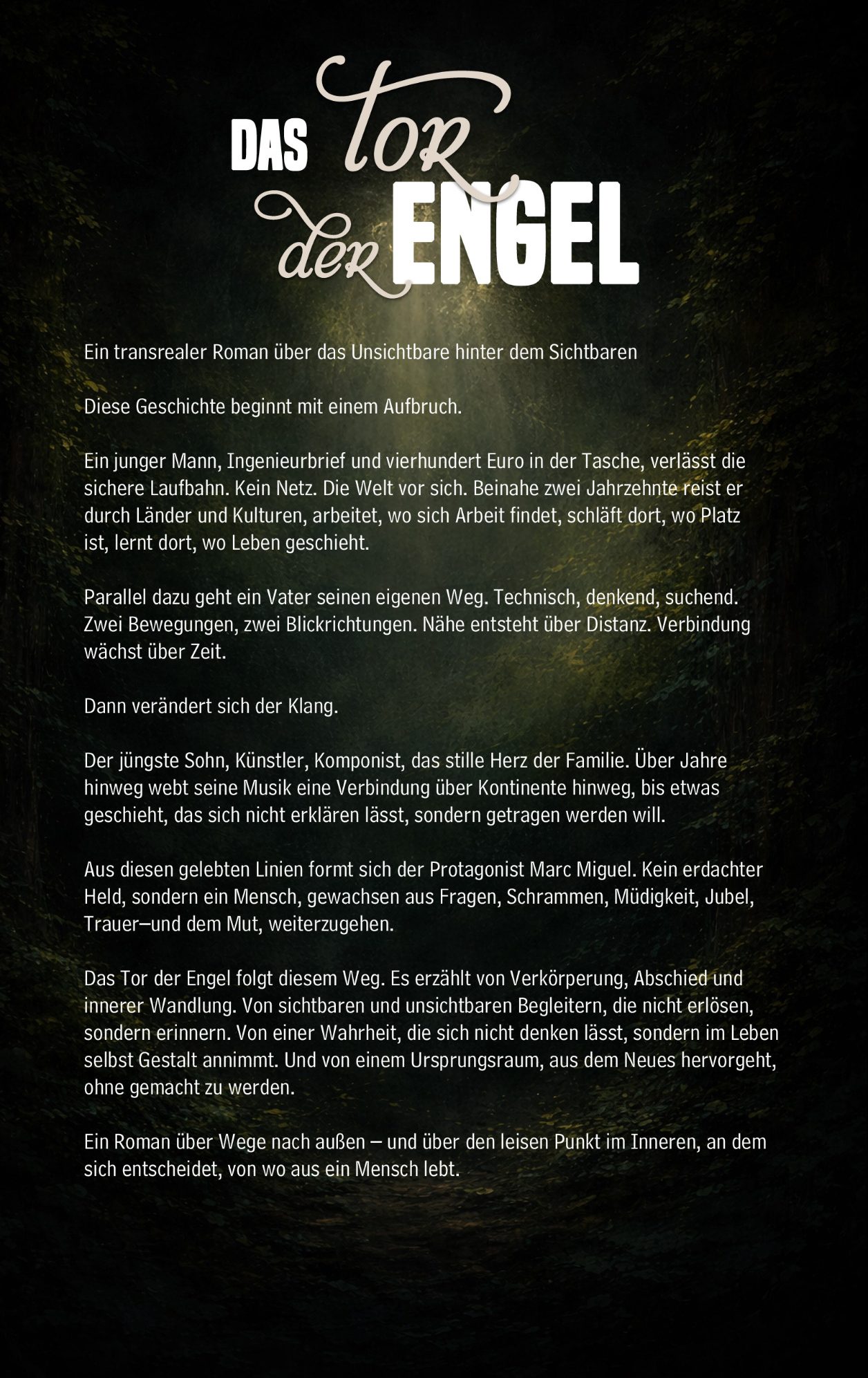 Als ich vor achtzehn Jahren begann, Das Tor der Engel zu schreiben, ging es mir nicht darum, eine andere Welt zu erfinden. Es ging darum, meinen ältesten Sohn zu verstehen und seinen Weg zu begleiten. Seine Entscheidungen öffneten mir einen Blick auf eine Wirklichkeit, die immer schon da war und nicht die Absicht hatte, mit meiner zu konkurrieren. Ich staunte darüber, dass er die Mühen einer langen Ausbildung und eines abgeschlossenen Ingenieurstudiums hinter sich ließ, obwohl eine vielversprechende Laufbahn möglich gewesen wäre. Zugleich empfand ich großen Respekt vor dem, was er in jungen Jahren erkannt und konsequent gelebt hat.